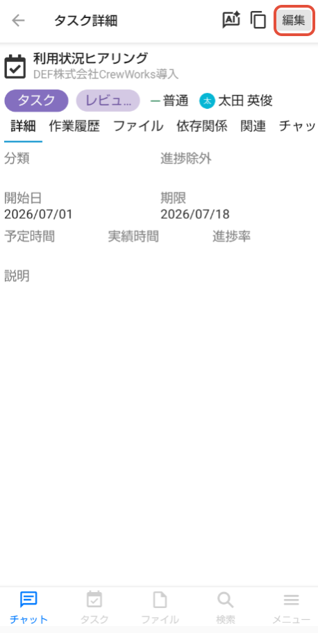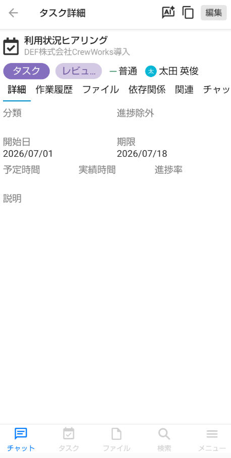 右上の「編集」ボタンをタップすると、タスクの編集画面を表示・編集することができます。