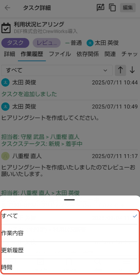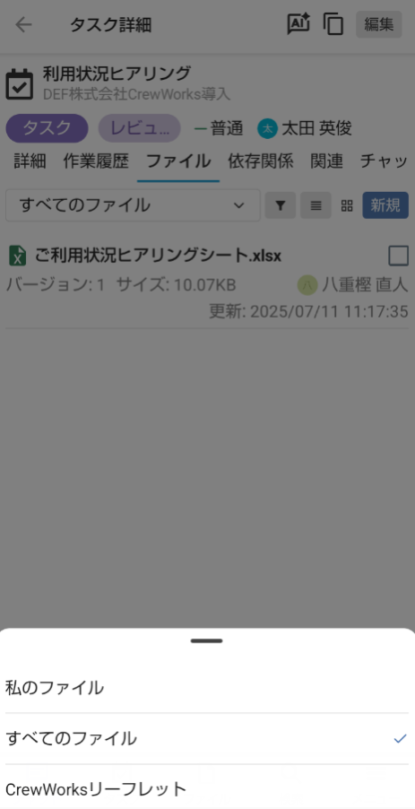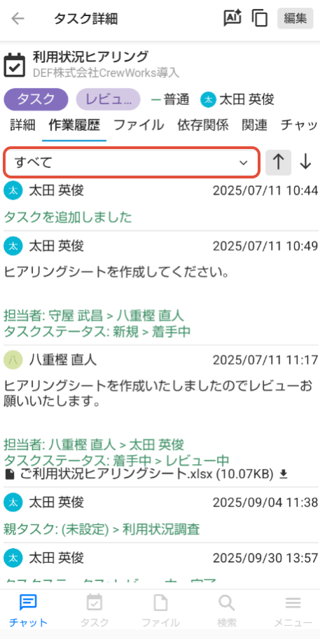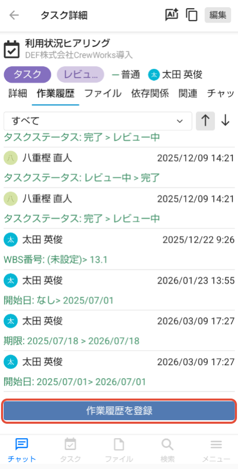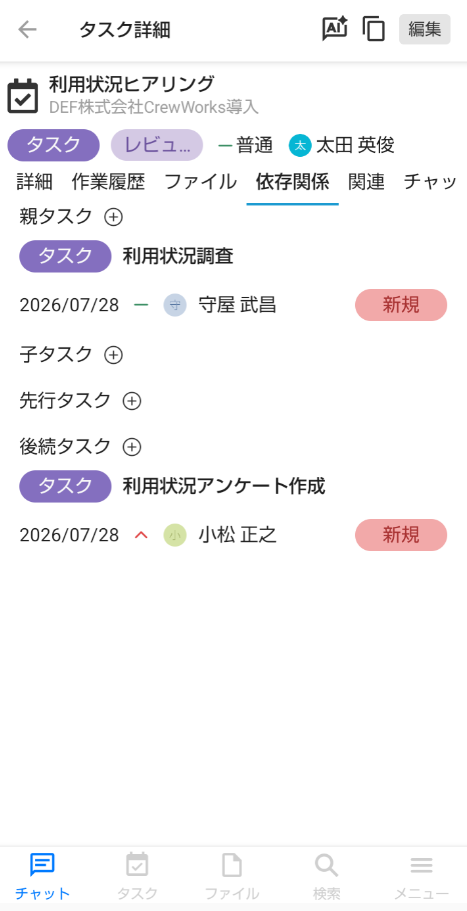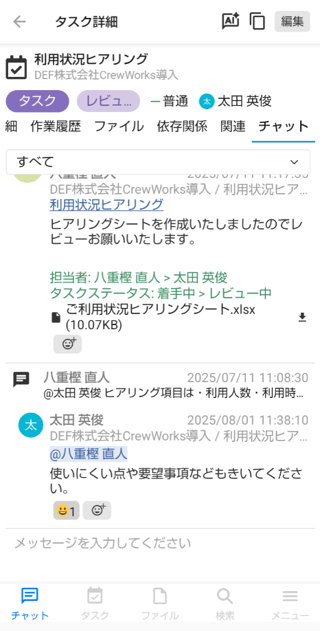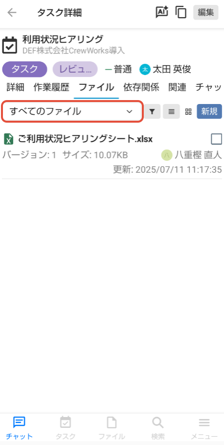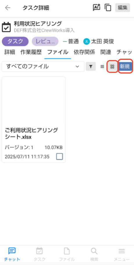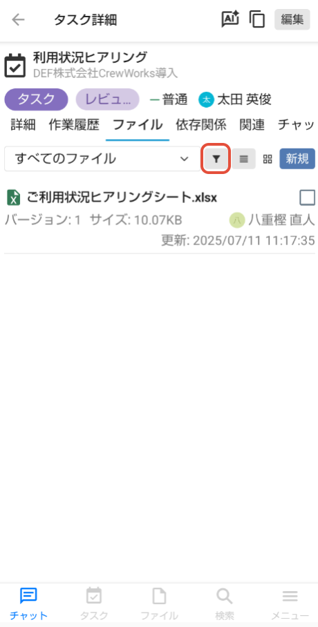 タスクリストを開く方法は、「CrewWorksの画面構成(スマホアプリ)」をご確認ください。「チャット」ボタン