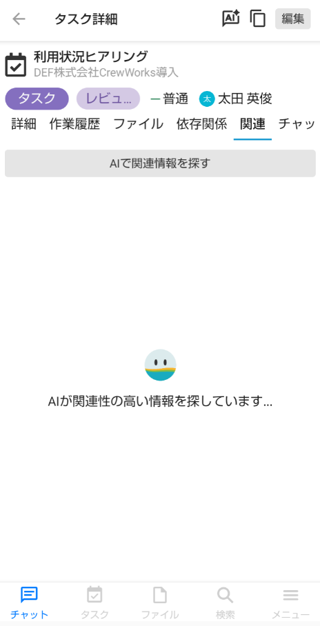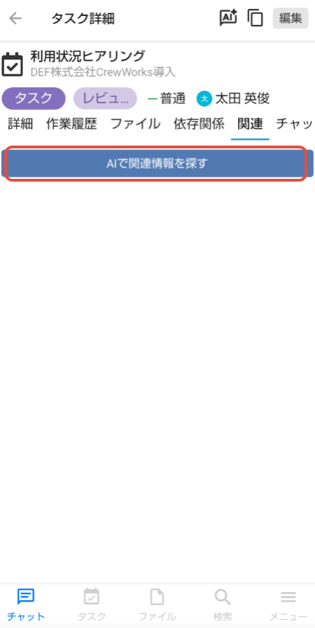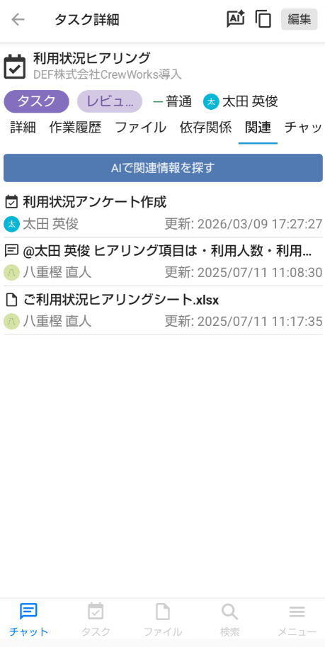 「AIで関連情報を探す」ボタンをタップすると、プロジェクト内の関連情報が表示されます。