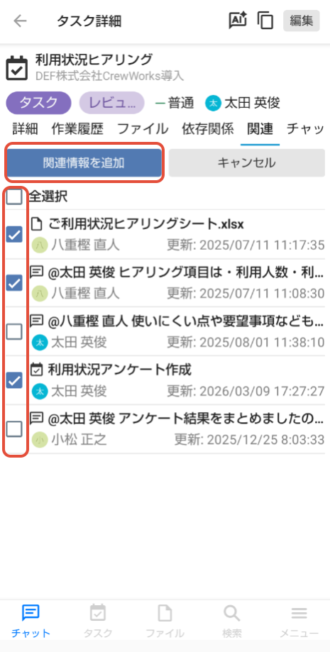 必要な情報を選択して「関連情報を追加」ボタンをタップすると、選択した情報が「関連情報」タブに追加されます。