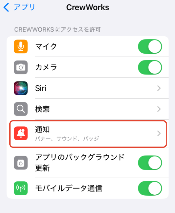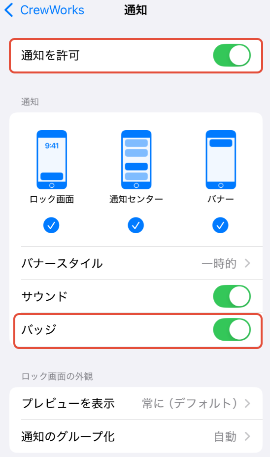 5. 「CrewWorksのすべての通知」と「通知ドットを許可」がオンになっていることを確認します。