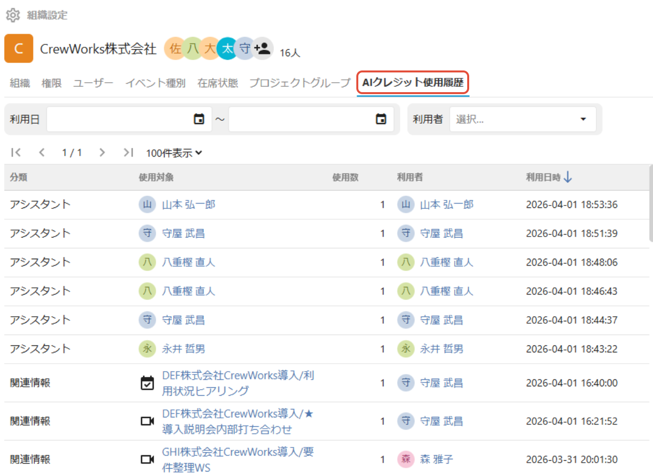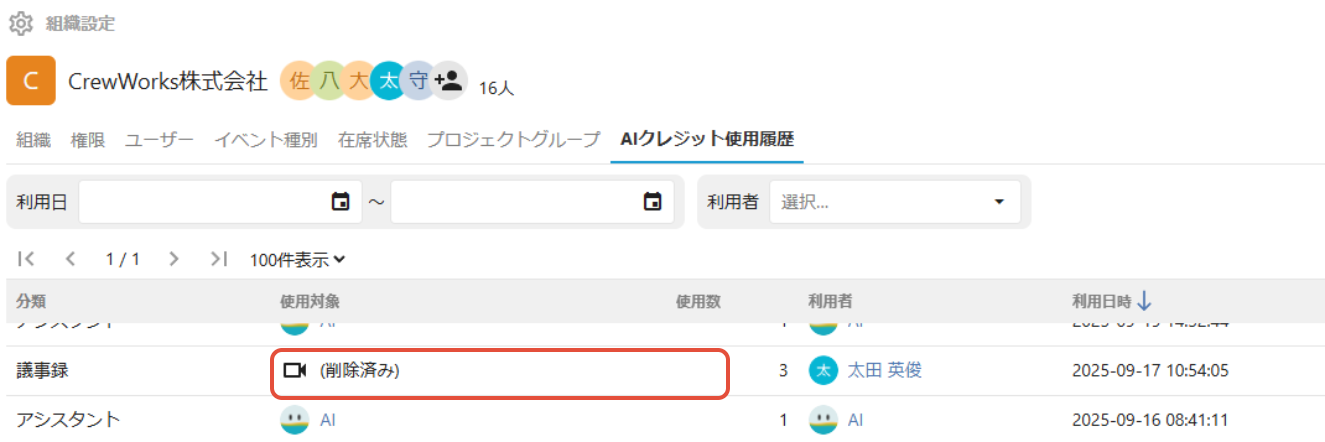 2. 「AIクレジット使用履歴」タブをクリックします。AIの使用履歴が表示されます。